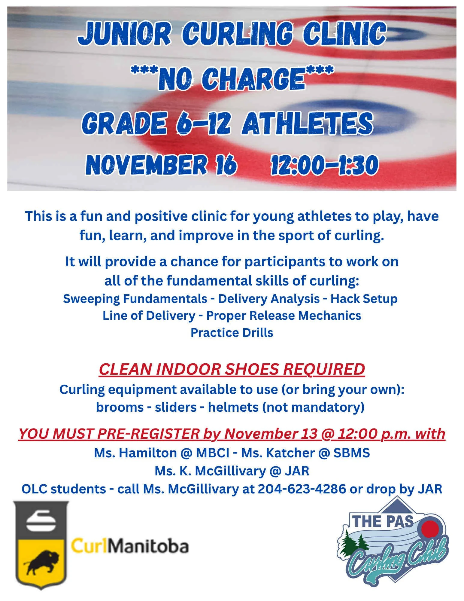 The Junior Curling Clinic will run from 12:00 P.M. to 1:30 P.M. Like the adult session, all participants are required to bring a clean pair of indoor shoes, and the registration deadline is also tomorrow at 12:00 P.M.