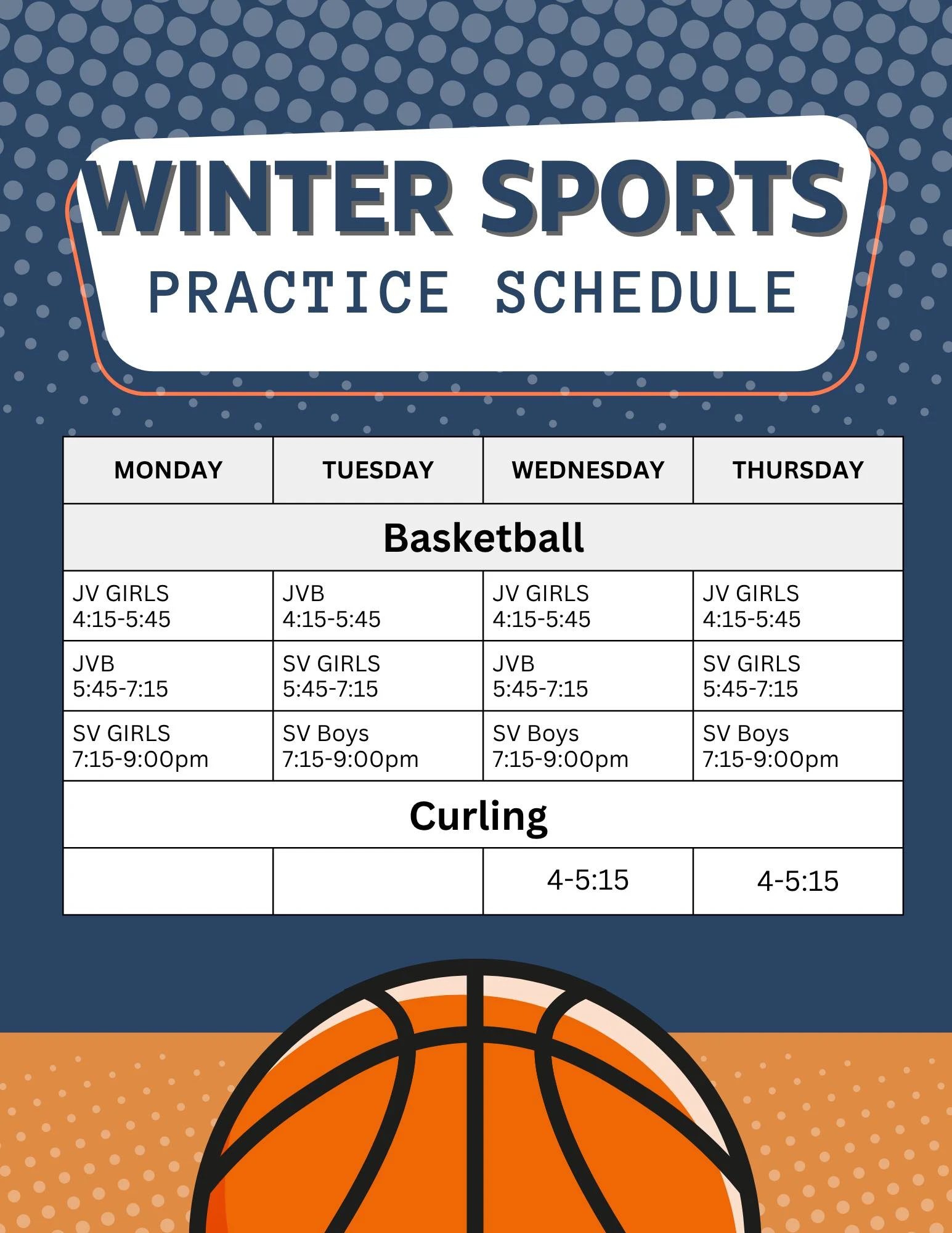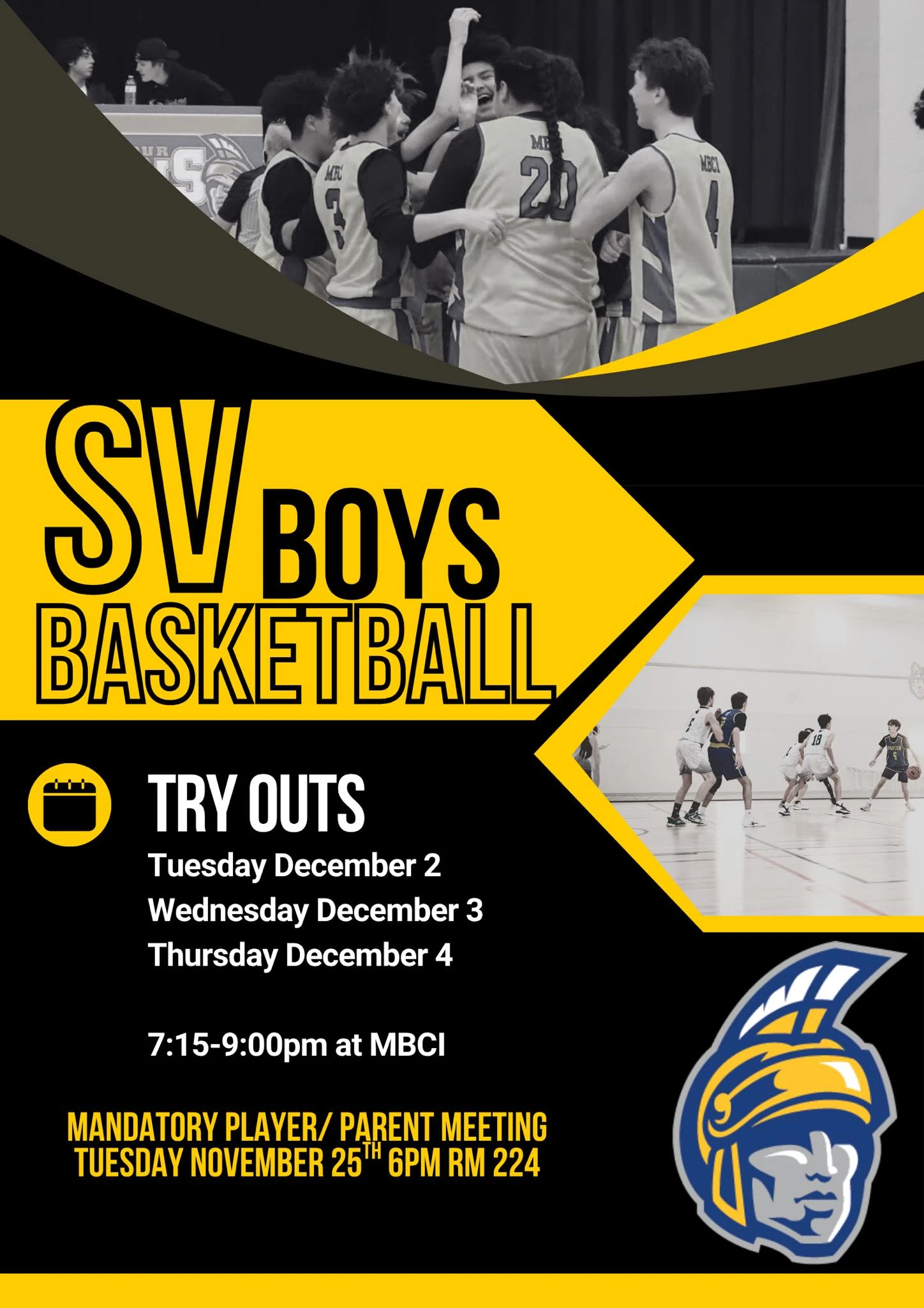 The official basketball practice schedule begins next month on December 1st. Any questions regarding that can be directed to Mrs. Graveline. The SV boys’ tryouts start on December 2nd and run until the 4th. There will also be a mandatory player/parent meeting next Tuesday at 6:00 P.M. in room 224.