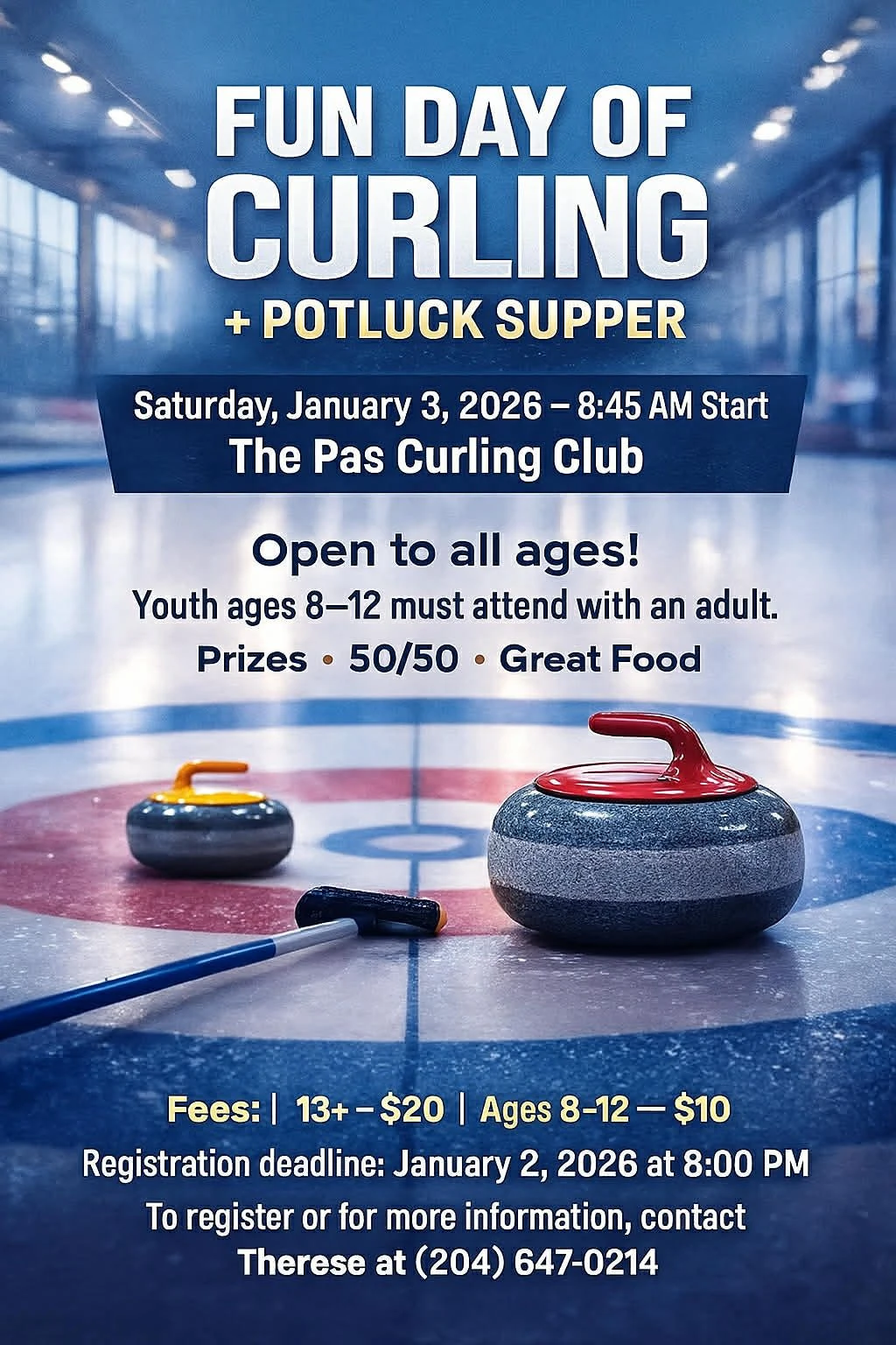 The Pas Curling Club will be hosting their Fun Day of Curling event this Saturday, January 3. This funspiel is open to all ages and will feature a potluck supper, a 50/50 draw, and some incredible prizes. Participants aged 13 and older can enter for $20, while children aged 8–12 cost $10. All children 12 and under must attend with an adult.