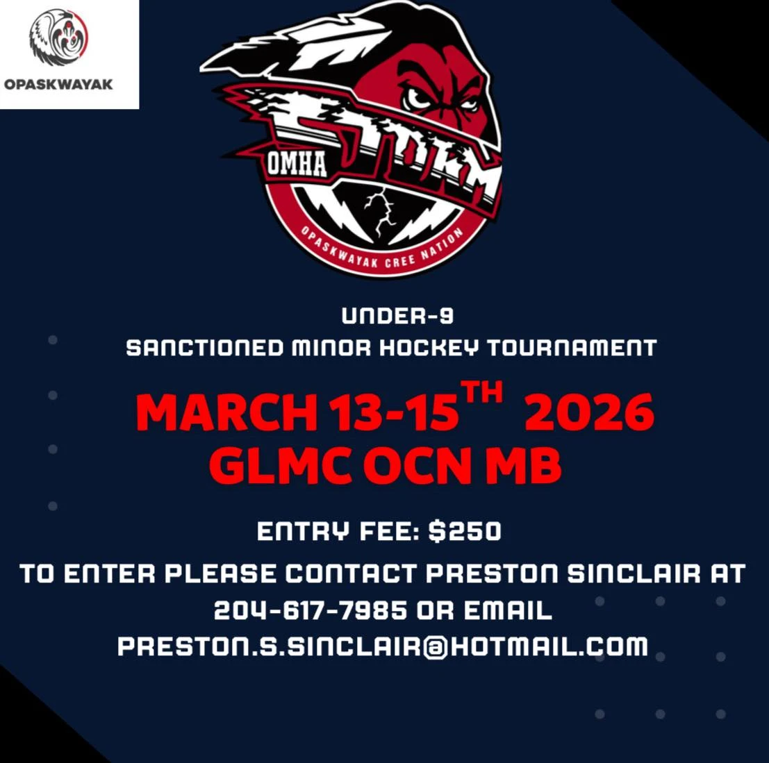 The OCN Minor Hockey Facebook page announced that an Under-9 sanctioned minor hockey tournament will take place at the Gordon Lathlin Memorial Centre from March 13 to 15 in OCN.