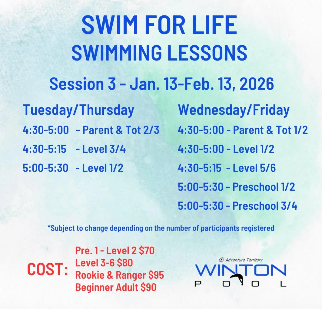 Session 3 of the Winton Pools Swim for Life swimming lessons kicks off today at the Winton Pool. Whether you’re looking to get back into the pool yourself or want to enroll your children so they can become confident, strong swimmers, stop by the front desk at the Wellness Centre to sign up.