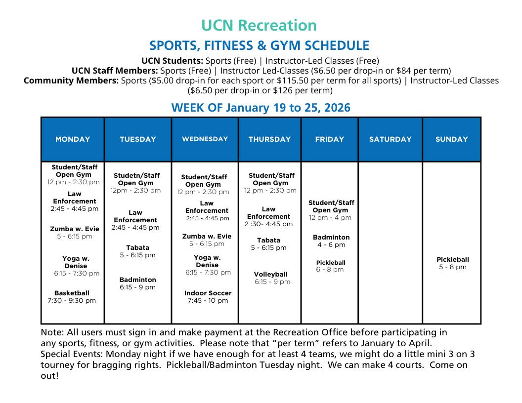 More information, including current and upcoming schedules, can be found on the UCN Student Life at The Pas Campus Facebook page.