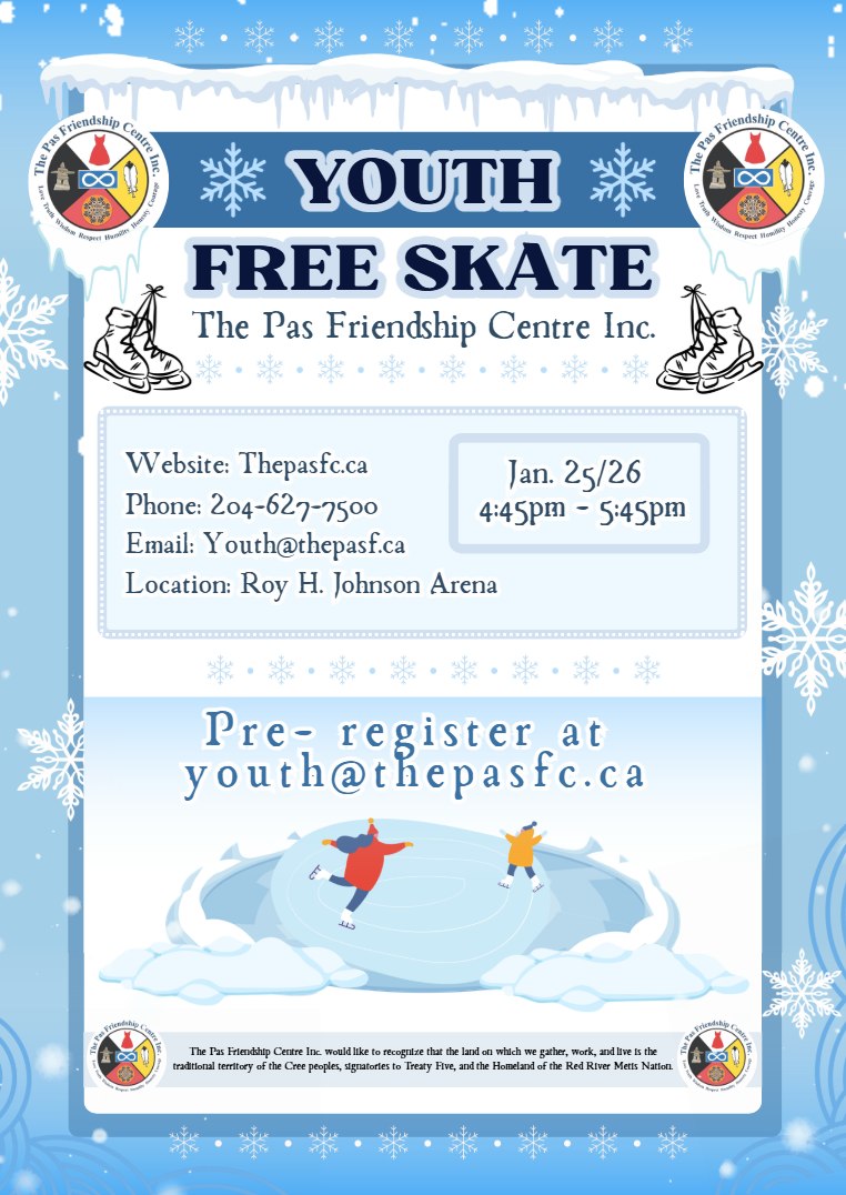 This Sunday at the Roy H. Johnston Arena, the Pas Friendship Centre will host a free youth skate from 4:45 p.m. to 5:45 p.m.