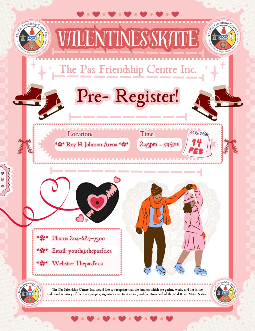 For those looking to go on a skate date this Valentine’s Day, The Pas Friendship Centre has sponsored a free hour of ice time at the Roy H. Johnston Arena for you and your loved one to enjoy.